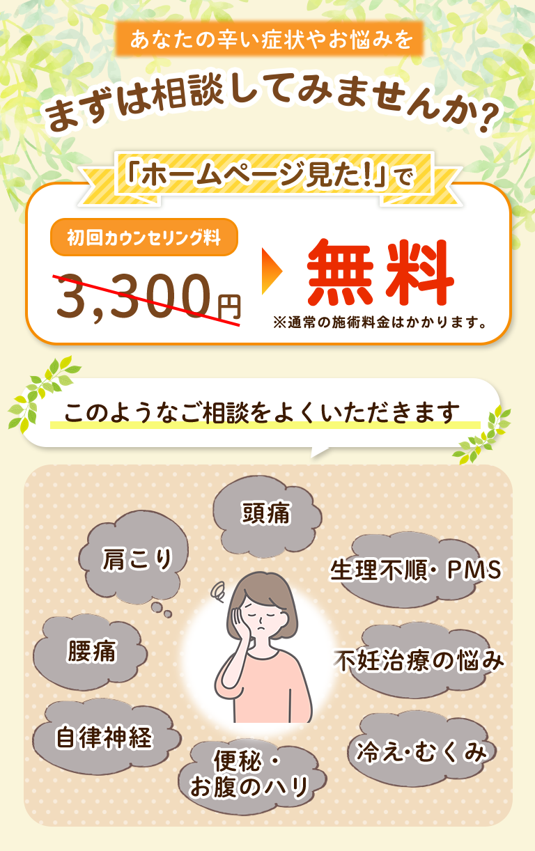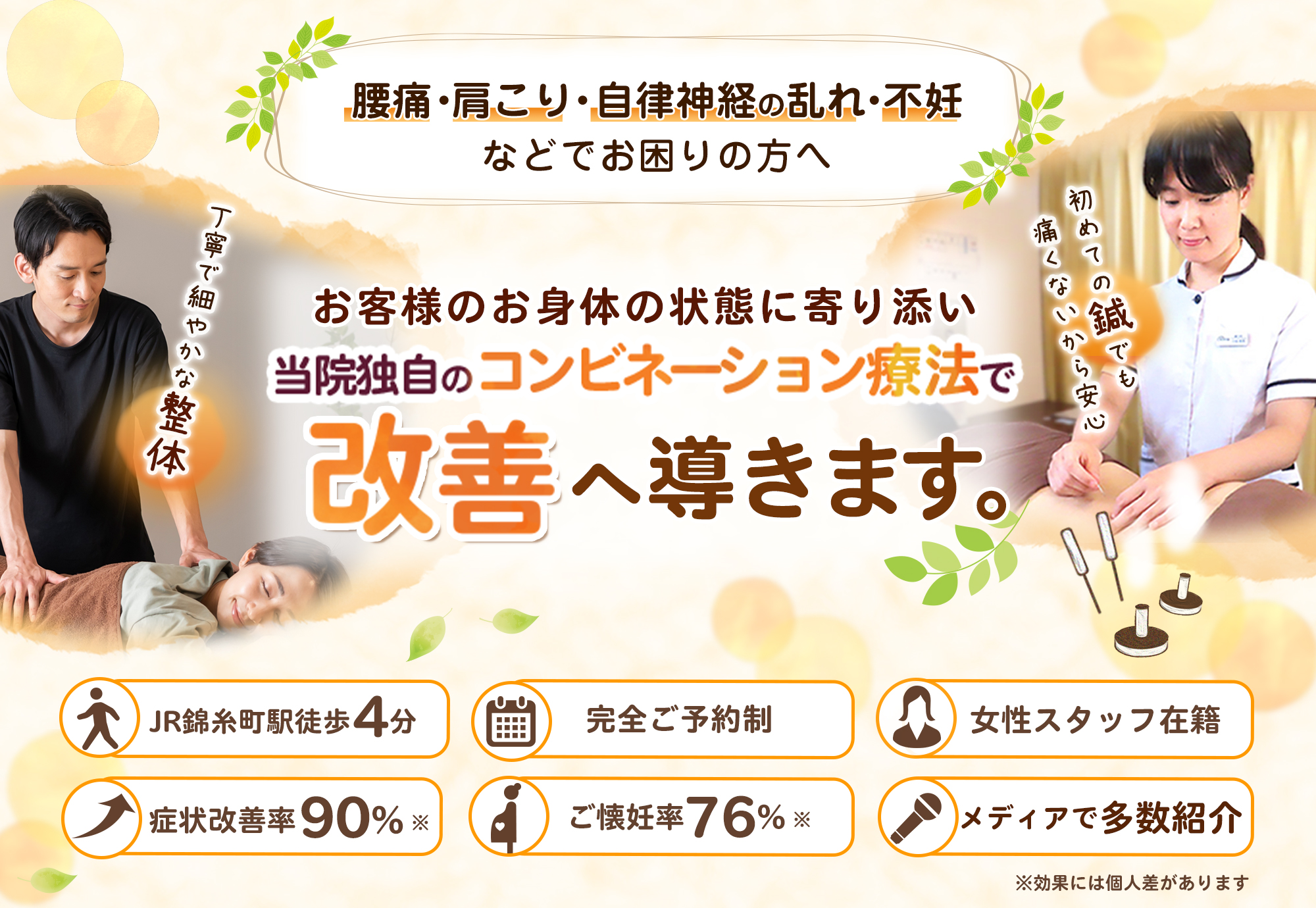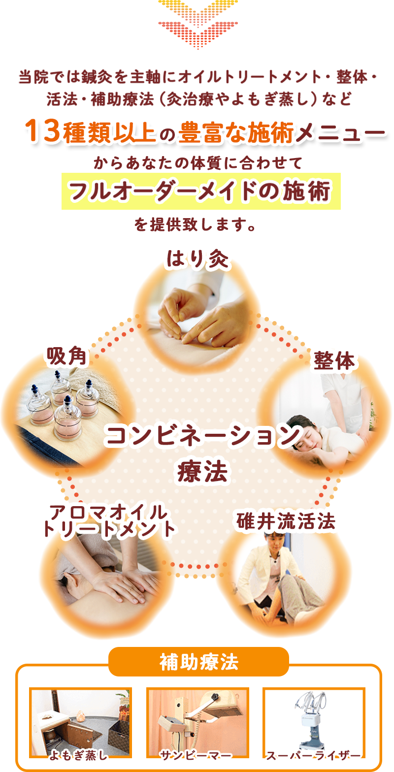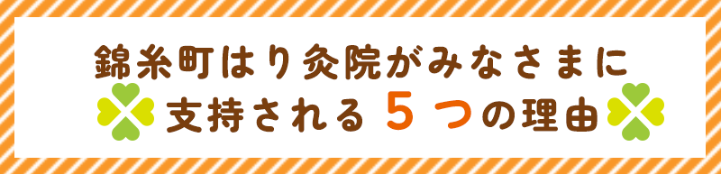 完全オーダーメイドの施術で改善。錦糸町はり灸院では、一人一人の体調やその時の状態に合わせて最適な施術を行うので安心して改善に専念できます。
