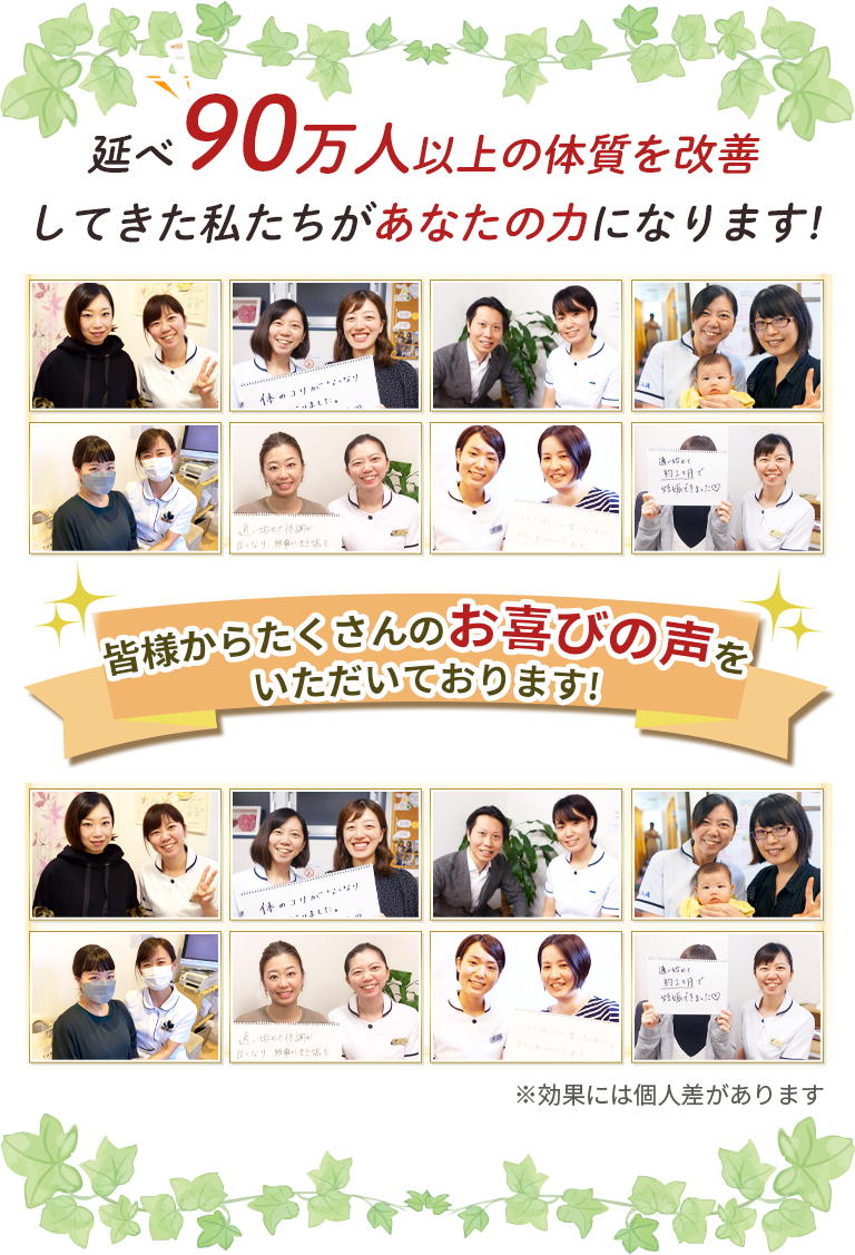 根本からの体質改善を実現。錦糸町はり灸院では、これまで延べ90万人以上の患者様と向き合い、10万症例以上もの臨床経験を活かして、あなたに合った最適な施術を行い、最適な提案を行うことをお約束します。
