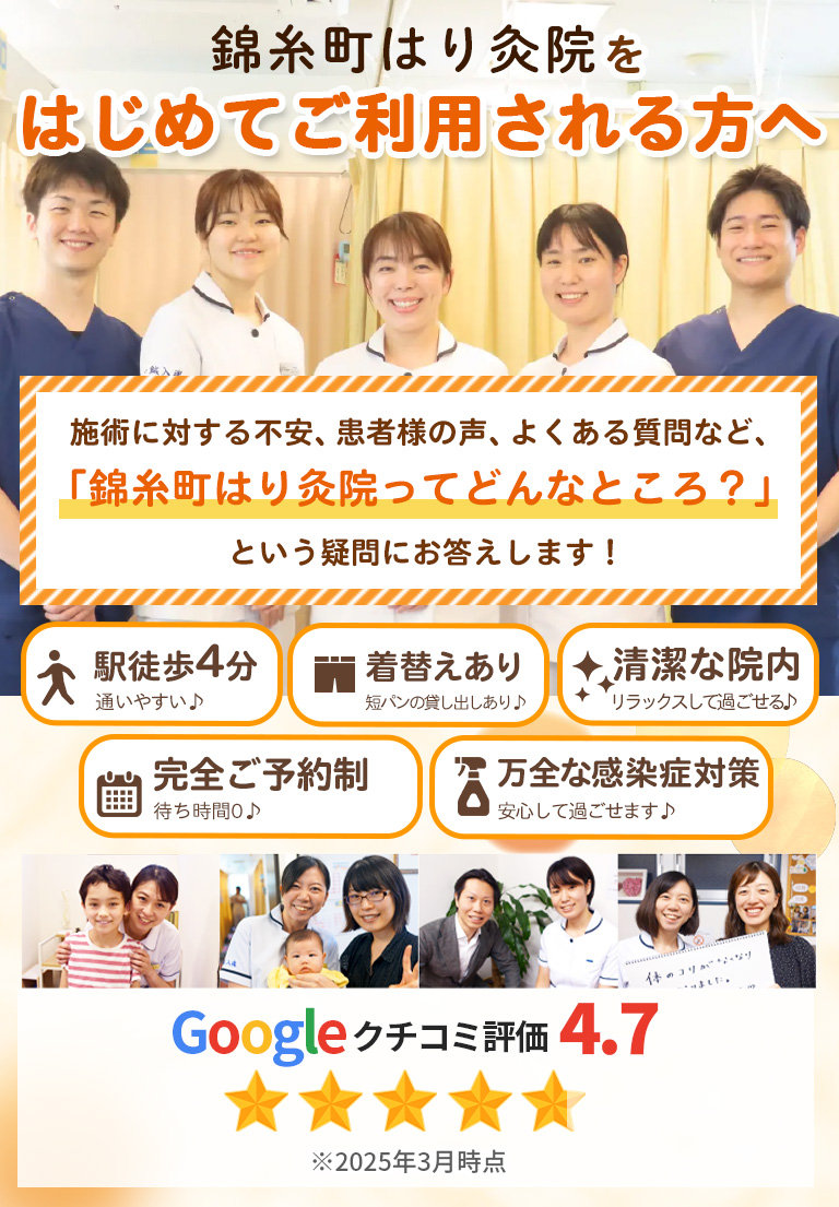 他の整体院や鍼灸院などは、国家資格を持たないスタッフが対応されていたりしますが、錦糸町はり灸院では、スタッフ全員が国家資格を保有しており当院規定の950時間以上の研修を受けた鍼灸師のみがお身体を担当させて頂きます。