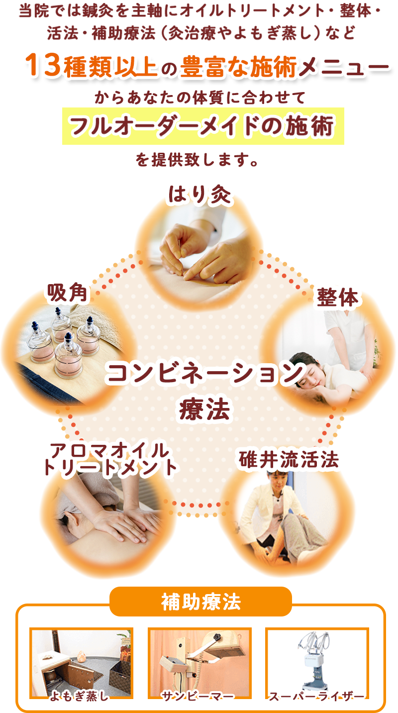 当院の特徴は治療技術にあります。そのために、通常の治療院よりも多い治療方法で対応しています。他院で良くならなかった方もぜひお越しください。
