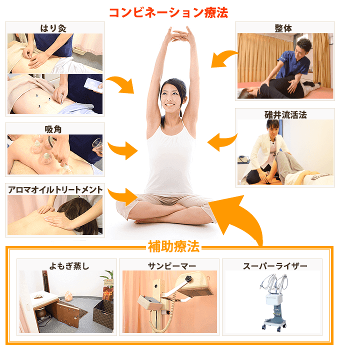 はりで経絡(ツボ)刺激して免疫を活性化させて、酸素オイルトリートメントで筋肉の緊張をほぐし、整体で骨格の歪みを解消します。さらに補助療法で運動機能向上や精神的リラックス、デトックス(毒素排泄)を促します。 これらの方法を、その日のあなたの体の状態に合わせて、組み合わせて行なっていきます。そのため普通の鍼灸院や整体院よりも非常に高い効果が得られるのです。
