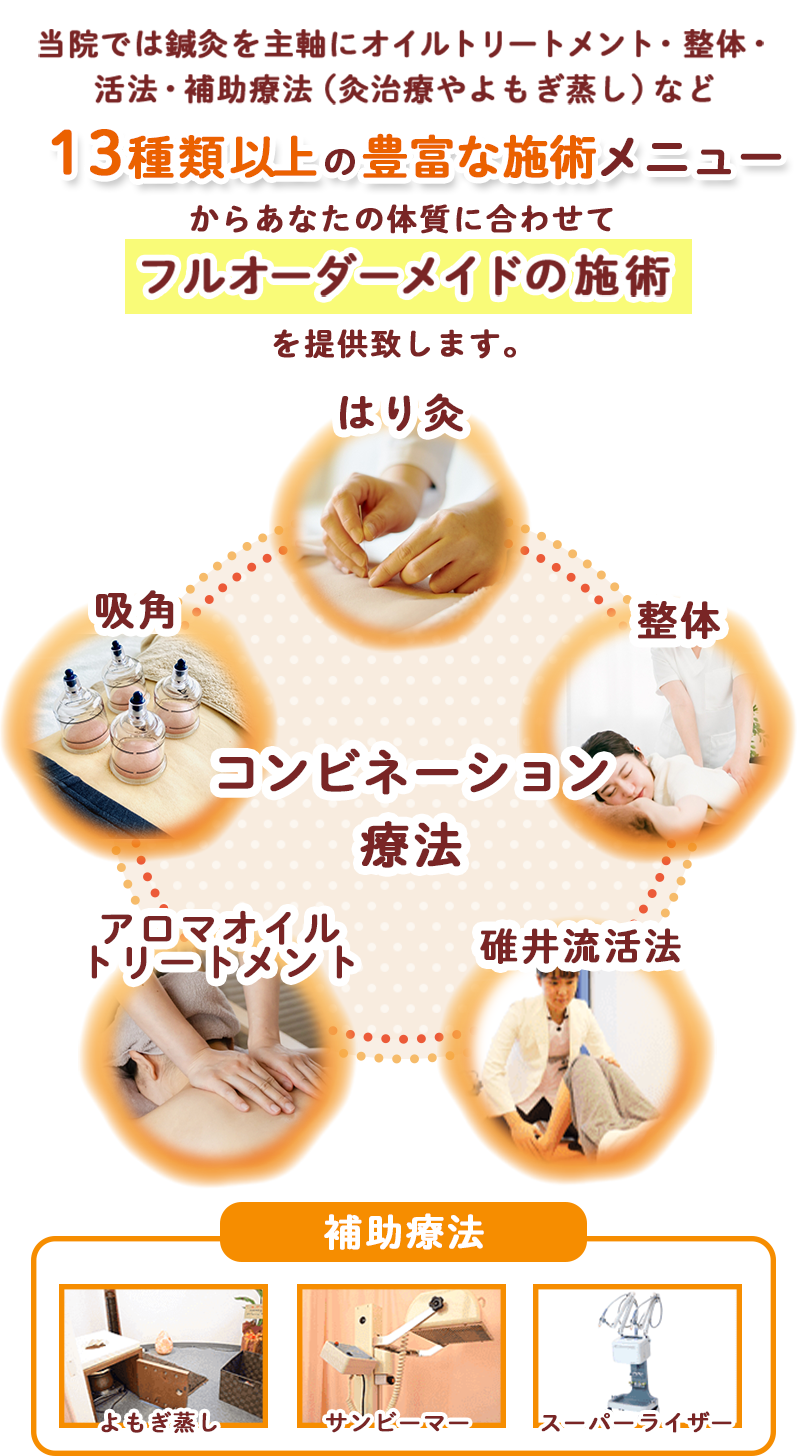 鍼灸を基本として、オイルトリートメント・整体・活法・補助療法と、方法が豊富にあります。そのため、ひとりひとりに合わせたオーダーメイド施術を実践しています。たとえば同じ症状でも、その方その方で原因は違います。
